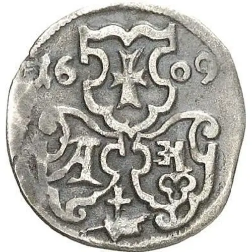 | Obverse description | Three shields of arms, one above two, date divided by one above |