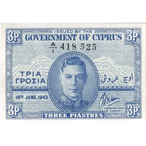 | نوشتههای روی اسکناس | Issued by the Government of Cyprus Τρια Γροσια Three Piastres |