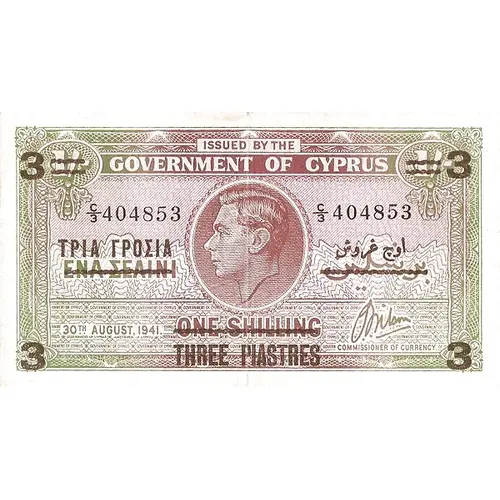 ISSUED BY THE GOVERNMENT OF CYPRUS ΤΡΙΑ ΓΡΟΣΙΑ اوچ غوش ΕΝΑ ΣΕΛΙΝΙ برسلين [Crossed out] ONE SHILLING [Crossed out] THREE PIASTRES (Translation: Three piastres, One Shilling [crossed out]) |