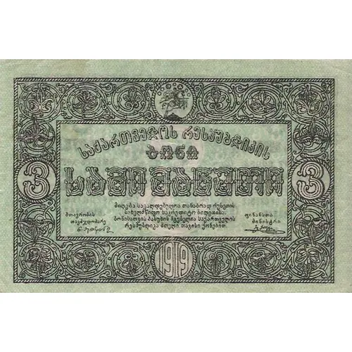 | Obverse lettering | საქართველოს რესპუბლიკის ბონი 3 სამი მანეთი 3 მიღება სავალდებულოა თანაბრად რუსეთის სახელმწიფო საკრედიტო ბილეთისა. ბონისათვის პასუხის მგებელია საქართველოს რესპუბლიკა მთელი თავისი ქონებით. 1919 (Translation: Bond of the Republic of Georgia, Three Maneti, Admission is required equally to a Russian state credit currency. The Republic of Georgia with all its property is responsible for this bond.) |