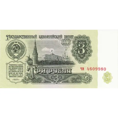 | Надписи лицевой стороны | Государственный Казначейский Билет СССР Три Рубля Государственные казначейские билеты обеспечиваются всем достоянием Союза ССР и обязательны к приему на всей территории СССР во все платежи для всех учреждений, предприятий и лиц по нарицательной стоимости. (Translation: USSR State Treasury Note Three Roubles State treasury notes are provided with all the property of the USSR and must be accepted throughout the territory of the USSR in all payments for all institutions, enterprises and individuals at face value.) |