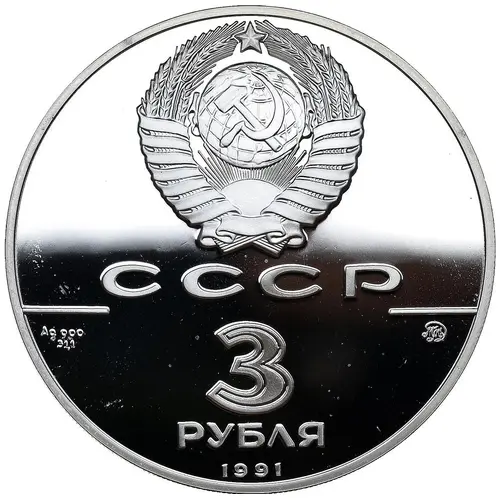 | Obverse lettering | СССР Ag 900 31,1 ММД 3 РУБЛЯ 1991 31,1 1991 (Translation: USSR Ag 900 31,1 MMD 3 Roubles 1991) |
