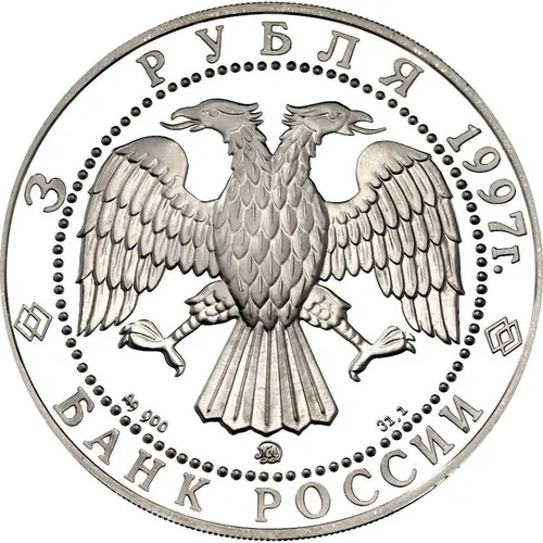 Obverse description The two-headed eagle designed by artist I. Bilibin. The inscriptions along the rim: at the top — «3 РУБЛЯ 1997 г.» (3 ROUBLES 1997), at the bottom — «БАНК РОССИИ» (BANK OF RUSSIA). The letters below indicate the metal sign, the fineness, the fine metal content and the mint trademark.