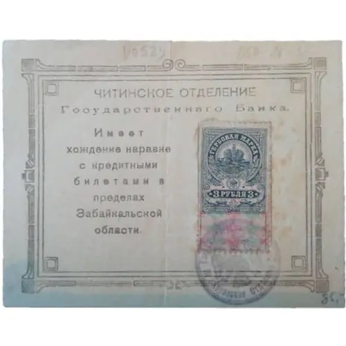 (Note) ЧИТИНСКОЕ ОТДЕЛЕНИЕ Государственнаго Банка. Имеет хождение наравне с кредитными билетами в пределах Забайкальской области. (Paper Stamp) Гербовая марки 2 рубля 2 (Ink stamp) Читинское Отделение Государственного Банка (Translation: (Note) CHITA BRANCH OF THE STATE BANK. Valid for use in the Baikal region on a par with banknotes. (Paper Stamp) Revenue Stamp 2 roubles 2 (Ink stamp) Chita Branch of the State Bank) |