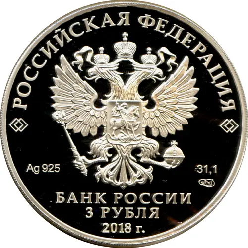 | Obverse description | On the mirror field of the disc the relief image of the National Coat of Arms of the Russian Federation, over it along the rim the semicircular inscription `РОССИЙСКАЯ ФЕДЕРАЦИЯ` (RUSSIAN FEDERATION), framed on both sides by doubled rhombuses, below under the coat of arms to the left indications of the precious metal and its fineness, to the right the fine metal content and the mint trade mark, at the bottom in the centre the inscription in three lines `БАНК РОССИИ` (BANK OF RUSSIA), the denomination of the coin `3 РУБЛЯ` (3 ROUBLES), the year of issue `2018 г.` (2018). |