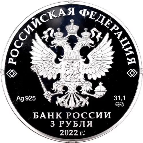 | نوشتههای روی سکه | РОССИЙСКАЯ ФЕДЕРАЦИЯ Ag 925 31,1 СПМД БАНК РОССИИ 3 РУБЛЯ 2022 г. (Translation: Russian Federation SPMD Bank of Russia Roubles) |