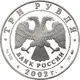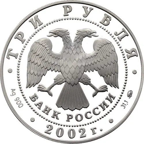 | Obverse description | In the centre - the Emblem of the Bank of Russia [the two-headed eagle with wings down, lower - the semicircular inscription - `БАНК РОССИИ` (BANK OF RUSSIA)) framed by a circle of dots and inscriptions along the rim: at the top - `ТРИ РУБЛЯ` (THREE ROUBLES), at the bottom - the year of issue `2002`, the letters to the left indicate the metal sign and the fineness , to the right - the fine metal content and the mint trade mark. |