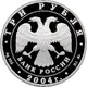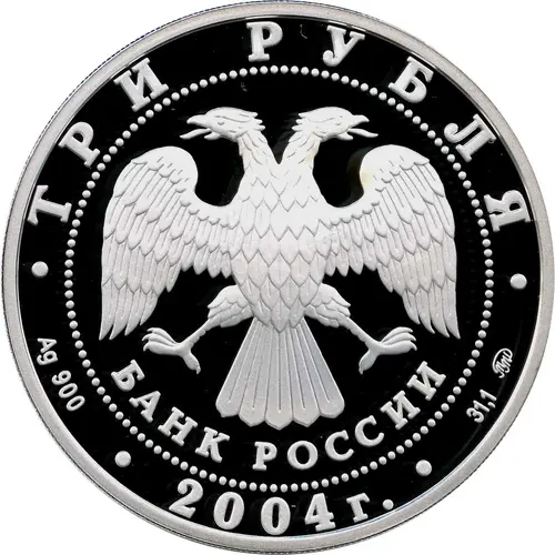 | Descripción del anverso | In the centre – the Emblem of the Bank of Russia [the two-headed eagle with wings down, lower – the semicircular inscription – «БАНК РОССИИ» (BANK OF RUSSIA)] framed by a circle of dots and inscriptions along the rim: at the top – «ТРИ РУБЛЯ» (THREE ROUBLES), at the bottom – the year of issue «2004», the letters to the left indicate the metal sign and the fineness, to the right – the fine metal content and the mint trade mark. |