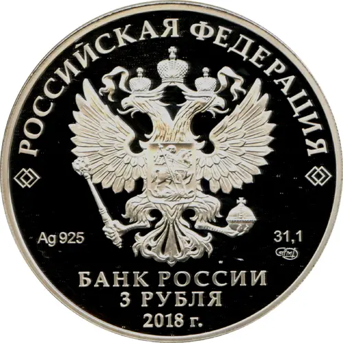 | Obverse lettering | РОССИЙСКАЯ ФЕДЕРАЦИЯ Ag925 31,1 СПМД БАНК РОССИИ 3 РУБЛЯ 2018 г. (Translation: RUSSIAN FEDERATION SPMD BANK OF RUSSIA ROUBLES) |