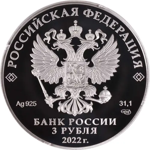 | Beschrijving voorzijde | The obverse of the coin features a relief image of the National Coat of Arms of the Russian Federation and the inscriptions ‘РОССИЙСКАЯ ФЕДЕРАЦИЯ’ (RUSSIAN FEDERATION) and ‘БАНК РОССИИ’ (BANK OF RUSSIA), the coin denomination ‘3 РУБЛЯ’ (3 ROUBLES), the year of issue ‘2022 г.’ (2022), the chemical symbol of the metal according to Mendeleev’s Periodic Table of Elements, fineness, the Saint Petersburg Mint trademark, and fine metal content. |