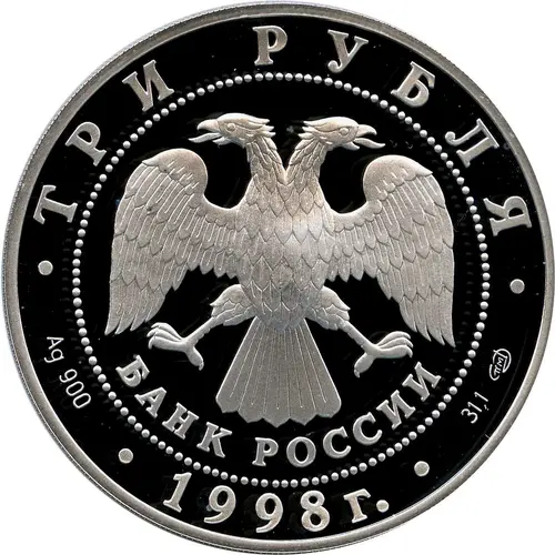 | Chữ khắc mặt trước | ТРИ РУБЛЯ БАНК РОССИИ • Ag 900 • 1998 г. • 31,1 СПМД • (Translation: Three Roubles Bank of Russia SPMD) |