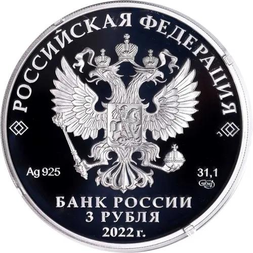 | نوشتههای روی سکه | РОССИЙСКАЯ ФЕДЕРАЦИЯ Ag 925 31,1 СПМД БАНК РОССИИ 3 РУБЛЯ 2022 г. (Translation: Russian Federation SPMD Bank of Russia Roubles) |