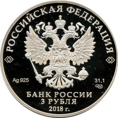 | Obverse lettering | РОССИЙСКАЯ ФЕДЕРАЦИЯ Ag 925 31,1 СПМД БАНК РОССИИ 3 РУБЛЯ 2018 г. (Translation: Russian Federation SPMD Bank of Russia Roubles) |