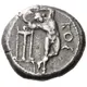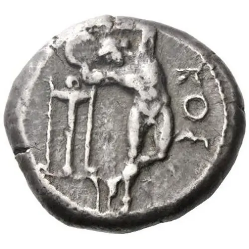 | Obverse description | Diskobolos, nude, hurling diskos right; tripod to left, ΚΟΣ to right. |