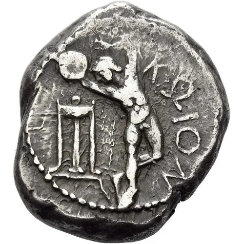 | Obverse description | Diskobolos, nude, hurling diskos right; tripod to left, KΩION to right |