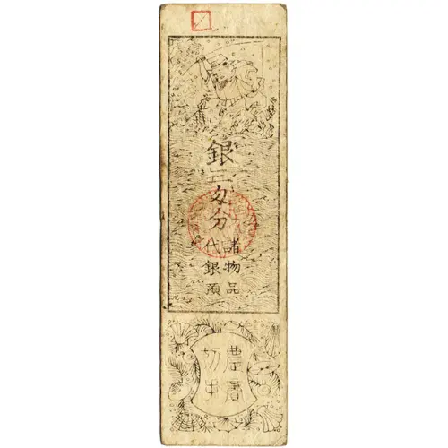 銀 三 匁 分 代諸 銀物 預品 切農 手商 (Translation: Three monme of silver Various things and goods charge a silver deposit Agriculture and commerce stamp) |