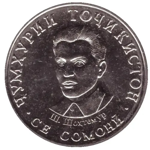 | 正面铭文 | • ҶУМҲУРИИ ТОҶИКИСТОН • Ш. Шоҳтемур СЕ СОМОНӢ (Translation: Republic of Tajikistan Sh. Shohtemur Three Somonii) |