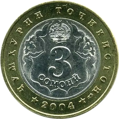 ★ ҶУМҲУРИИ ТОҶИКИСТОН ★ 2004 3 СОМОНӢ СПМД (Translation: Republic of Tajikistan 3 Somonii SPMD (St. Petersburg mint mark)) |