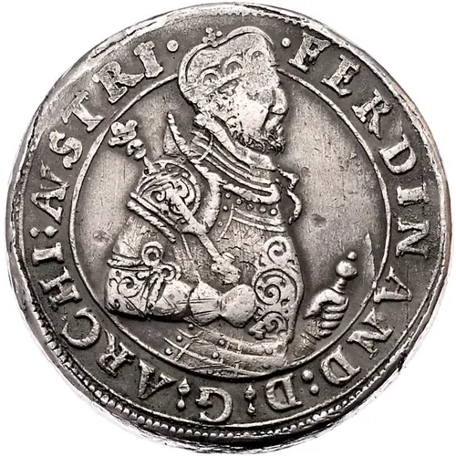 Half portrait of Ferdinand II, Archduke of Further Austria and Tirol with armour holding sceptra and sword, inner circle. The top of the head breaks the circle. Arabesques as ornament. |