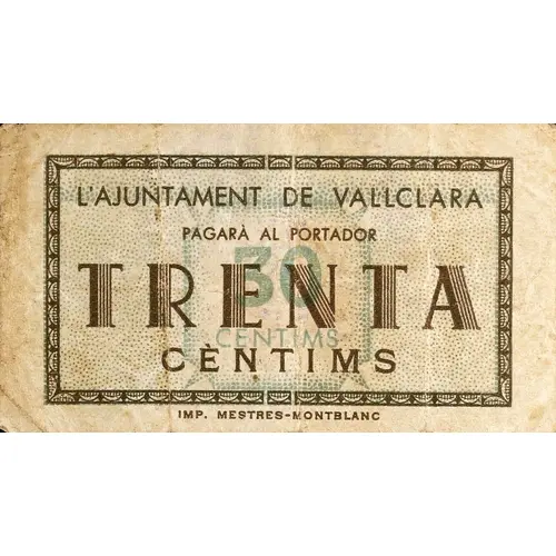 (Translation: The City Council of Vallclara Will pay the bearer Thirty Centimos)