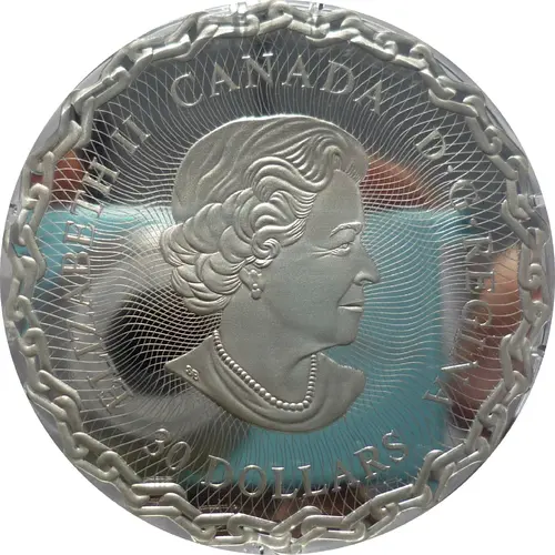 Designed by Claire Watson, your coin is a stylized, symbolic celebration of the St. Lawrence Seawayon its 60th anniversary. It features a head-on viewof an eastbound bulk carrier (laker) transiting through the St. Lambert lock, where the Montréal skyline is visible in the distance. A split maple leaf andstar represents a binational partnership between Canada and the United States. A symbol of strength andlongevity, an anchor chain forms the rim like corrugated denticles and gives the coin its unusual shape. The reverse includes the words `THE ST. LAWRENCE SEAWAY` and `LA VOIE MARITIME DU SAINT-LAURENT` on a scroll banner that also bears a stylized anchor. |