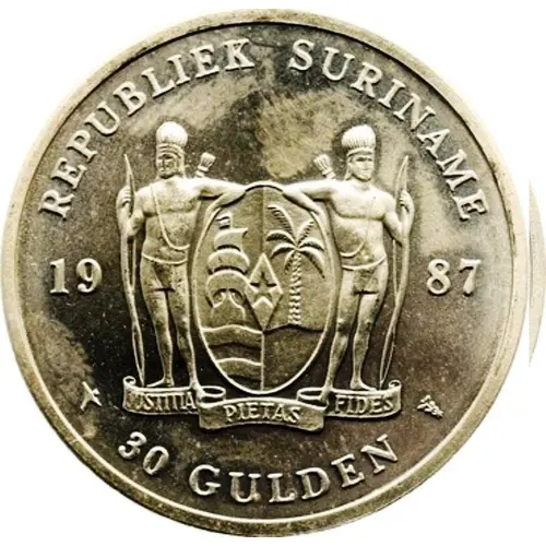 | Obverse lettering | REPUBLIEK SURINAME 1987 JUSTITIA PIETAS FIDES 30 GULDEN (Translation: Republic of Suriname Justice, Piety, Faith) |