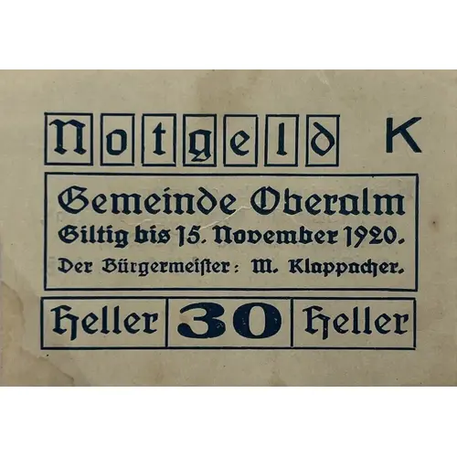 | Obverse lettering | Notgeld K Gemeinde Oberalm Giltig bis 15. November 1920. Der Bürgermeister: M. Klappacher. Heller 30 Heller |
