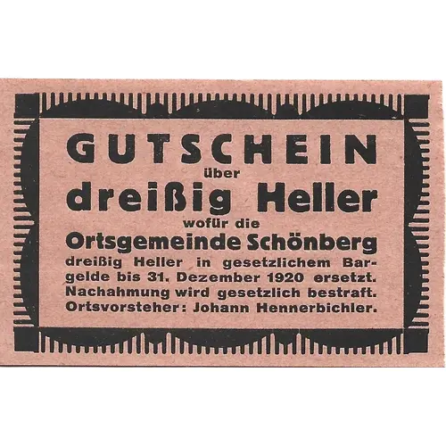 Opis líce GUTSCHEIN über dreißig Heller wofür die Ortsgemeinde Schönberg dreißig Heller in gesetzlichem Bar- gelde bis 31. Dezember 1920 ersetzt. Nachahmung wird gesetzlich bestraft. Ortsvorsteher: Johann Hennerbichler.
