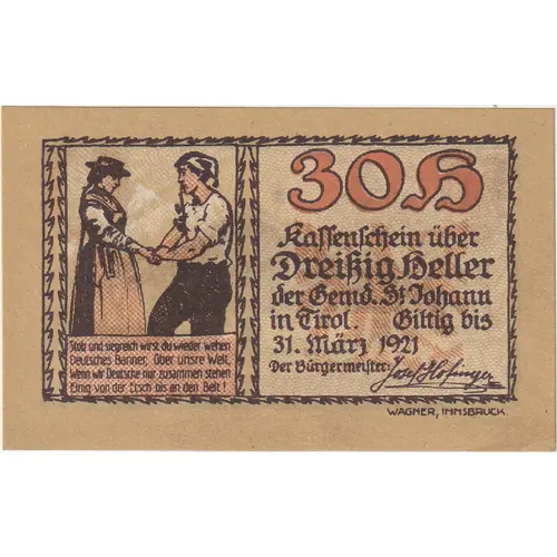 | Obverse lettering | 30h Kassenschein über Dreizig heller der Gemd. St. Johann in Tirol. Giltig bis 31 Marz 1921 |