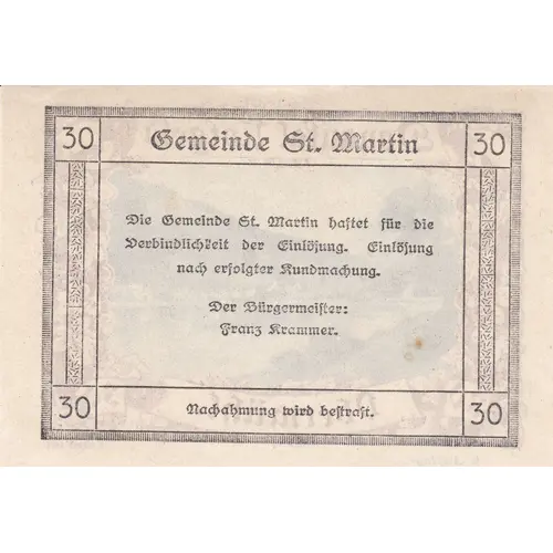 30 Gemeinde St. Martin 30 Die Gemeinde St. Martin haftet fur die Verbindlichbeit der Einlofung. Einlofung nach erfolgter Kundmachung. Der Burgermeister: Franz Krammer. 30 Nachahmung wird bestraft. 30 (Translation: 30 Municipality of St. Martin 30 The municipality of St. Martin is liable for the Obligation of consignment. consignment after notification. The mayor: Franz Krammer. 30 Imitation will be punished. 30) |