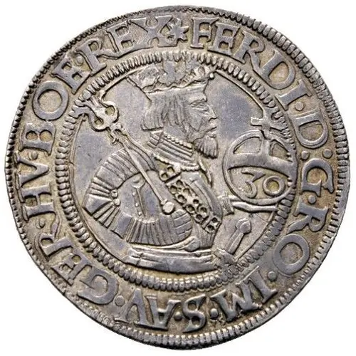 Bearded portrait, half size, with armour, facing right, of Ferdinand I. Sceptre at right hand and orb bearing the value at left hand. Continuous legend (starts 12h).