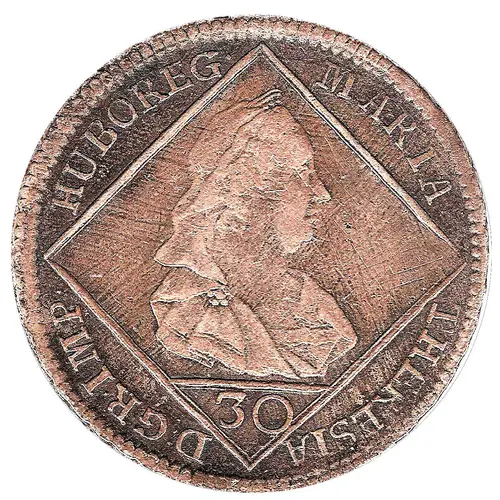 | Obverse description | Veiled portrait of Maria Theresia of habsburg within a rhombus, value in exergue below, legend around in 4 parts for `Maria Theresia Dei Gratia Romanorum Imperatrix Hungariae Bohemiae Regina` |