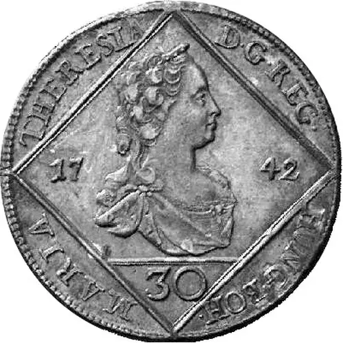 | Descrizione del dritto | The portrait facing right of Maria Theresia divides the date, value below a line, the whole in a rhombus that divides the legend. |
