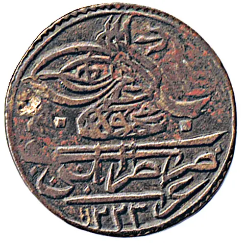 | Beschrijving voorzijde | Toughra of Mahmud II with flower above mint and date, within circle. |