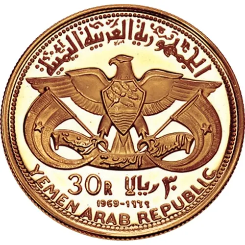 | Obverse lettering | الجمهورية العربية اليمنية الجمهورية العربية اليمنية 30 R ٣٠ ريالا 1969 - ١٩٦٩ YEMEN ARAB REPUBLIC |