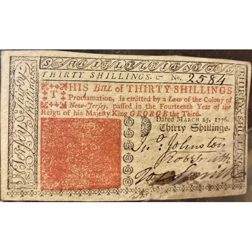 THIRTY SHILLINGS. No. 2584 THIS Bill of THIRTY SHILLINGS Proclamation, is emitted by a Law of the Colony of New-Jerſey, paſſed in the Fourteenth Year of the Reign of his Majeſty King GEORGE the Third. / Dated MARCH 25, 1776 |