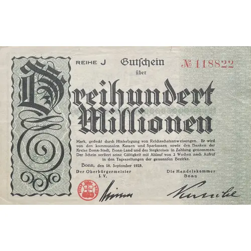 Gutschein über Dreihundert Millionen Mark, gedeckt durch Hinterlegung von Reichsschaßanweisungen. Er wird von den kommunalen Kassen und Sparkassen sowie den Banken der Kreise Bonn-Stadt, Bonn-Land unddes Siegkreises in Zahlung genommen. Der Schein verliert seine Gültigkeit mitAblauf von 2 Wochen nach Aufruf in den Tageszeitungen der gennanten Bezirke. Bonn, den 18. September 1923 Der Oberbürgermeister I. V. Die Handelskammer Bonn (Translation: Voucher for Three hundred million Marks, backed by deposits of Reich Finance Promissory Notes. It is accepted as payment by the municipal treasuries and savings banks as well as the banks of Bonn-City, Bonn-Land, and Siegkreis District. The voucher expires two weeks after its publication in the daily newspapers of the aforementioned districts. Bonn, September 18, 1923 The Lord Mayor I. V. The Bonn Chamber of Commerce) |