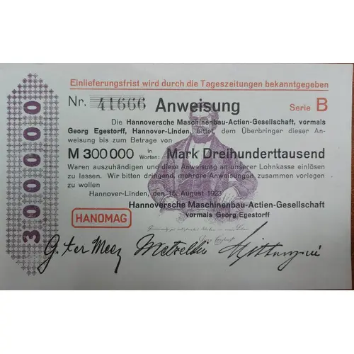 300000 Einlieferungsfrist wird durch die Tageszeitungen bekanntgegeben Nr. - Serie B Anweisung Die Hannoversche Maschinenbau-Actien-Gesellschaft, vormals Georg Egestorff, Hannover-Linden, bittet, dem Überbringer dieser An- weisung bis zum Betrage von M 300000 in Worten: Mark Dreihunderttausend Waren auszuhändigen und diese Anweisung an unserer Lohnkasse einlösen zu lassen. Wir bitten dringend, mehrere Anweisungen zusammen vorlegen zu wollen Hannover-Linden, den 16. August 1923 Hannoversche Maschinenbau-Actien-Gesellschaft vormals Georg Egestorff HANOMAG (Translation: 300,000 Deadline for submission will be announced in the daily newspapers. No. Instruction The Hannoversche Maschinenbau-Actien-Gesellschaft, formerly Georg Egestorff, Hannover-Linden, requests that the bearer of this note be given goods up to the amount of 300,000 Marks in words: Three hundred thousand Marks and that this note be cashed at our payroll office. We urgently request that several notes be submitted together. Hannover-Linden, August 16, 1923 Hannoversche Maschinenbau-Actien-Gesellschaft formerly Georg Egestorff HANOMAG) |