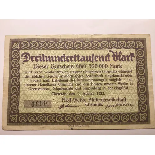 DREIHUNDERTTAUSEND MARK Dieser Gutschein über 300 000 Mark wird bis 30.Septembr.1923 an unserer Hauptkasse Chemnitz wahrend der üblichen Geschafsstunden gegen Bankscheck eingetauscht oder—-soweit nach Behebung des Banknotenmangels möglich—-an unserer Hauptkasse Chemnitz und den Kassen unserer Werke in Oberlichtenau,Scharfenstein und Tannenberg in bar eingelöst. Chemnitz,den 4.August 1923 MOLL=WERKE AKTIENGESELLSCHAFT Chemnitz |