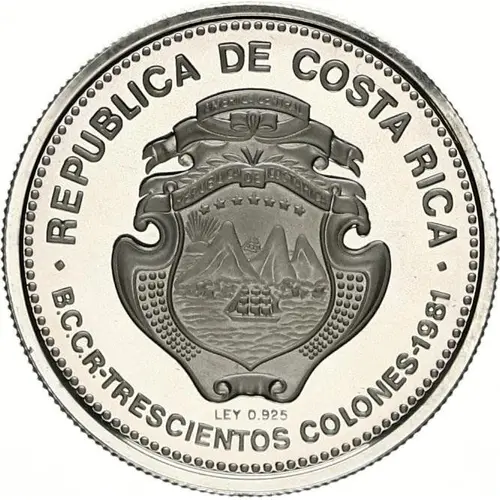 | Obverse lettering | · REPUBLICA DE COSTA RICA · AMERICA CENTRAL REPUBLICA DE COSTA RICA LEY 0.925 B.C.C.R. - TRESCIENTOS COLONES - 1981 (Translation: Costa Rica Central America Republic of Costa Rica 0.925 Purity Central Bank of Costa Rica - Three Hundred Colones) |