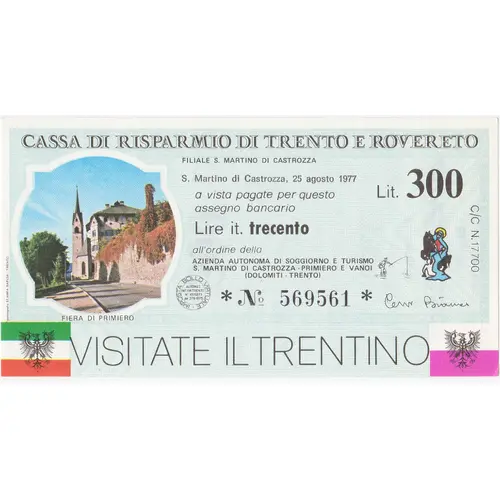 CASSA DI RISPARMIO DI TRENTO E ROVERETO FILIALE S. MARTINO DI CASTROZZA S. Martino di Castrozza, 25 agosto 1977 a vista pagate per questo assegno bancario Lire it. trecento all`ordine della AZIENDA AUTONOMA DI SOGGIORNO E TURISMO S. MARTINO DI CASTROZZA - PRIMIERO E VANOI (DOLOMITI - TRENTO) (dans un cercle :) IMPOSTA BOLLO VIRTUALE AUTORIZZ. INT. FIN. TRENTO N° 43752/73 del 27-9-1973 * N° 569561 * (signature) PIERA DI PRIMIERO VISITATE IL TRENTINO (verticalement à droite : ) C/C N. 17700 |