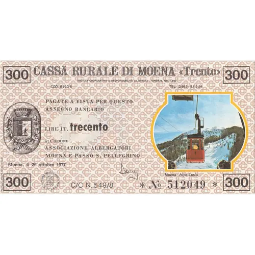 300 300 CASSA RURALE DI MOENA « Trento » SOCIETÀ COOPERATIVA A RESPONSABILITÀ ILLIMITATA - FONDATA NEL 1899 COD. 8140-6 TEL. (0462)53 2 25 PAGATE A VISTA PER QUESTO ASSEGNO BANCARIO LIRE IT. trecento ALL`ORDINE ASSOCIAZIONE ALBERGATORI MOENA E PASSO S. PELLEGRINO Moena, li 26 ottobre 1977 (signature) Moena - Alpe Lusia (dans un petit cercle :) AUT. INT. DI FINANZA TRENTO N. 42994/73 del 27.9.1973 - IMPOSTA DI BOLLO ASSOLTA IN MODO VIRTUALE C/C N. 549/8 * N° 512049 * 300 300 |