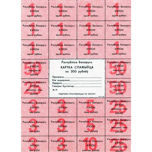 Obverse lettering Рэспубліка Беларусь КАРТКА СПАЖЫЎЦА на 300 рублёў Прозвішча __________ Кім выдадзена __________ Кіраўнік __________ Галоўны бухгалтар __________ М. П. ПАДРОБКА ПРАСЛЕДУЕЦЦА ПА ЗАКОНУ