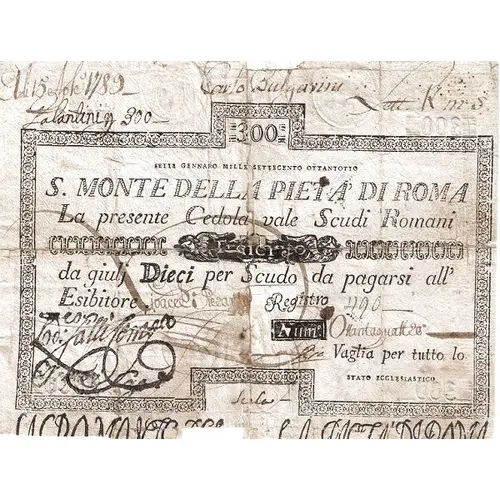| Obverse lettering | 300 SETTE GENNARO MILLE SETTECENTO OTTANTOTTO S. M. DI PIETA DI ROMA La presente Cedola vaglia Scudi Romani Trecento da giulj dieci per Scudo da pagarsi all` Esibitore. |