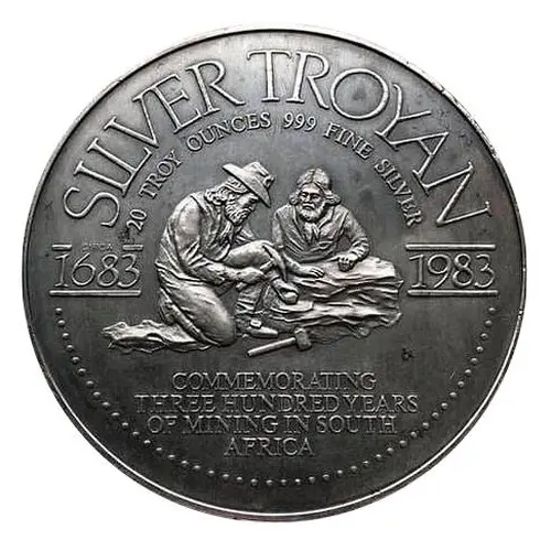 SILVER TROYAN 20 TROY OUNCES 999 FINE SILVER 1683 1983 COMMEMORATING THREE HUNDRED YEARS OF MINING IN SOUTH AFRICA |