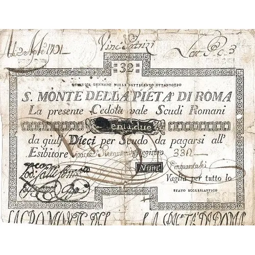 | Надписи лицевой стороны | 32 GENNARO MILLE SETTICENTO OTTANTOTTO S. M. DI PIETA DI ROMA La presente Cedola vaglia Scudi Romani Trentadue da giulj dieci per Scudo da pagarsi all` Esibitore. |