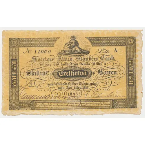 Sveriges Rikes Ständers Bank inlöser vid anfordran denna Sedel å RDR 1 RDG Skillingr Trettiotvå Banco RDR 1 RDG med 1/4 Riksdr. Silfver Specie enligt 1830 Ård Mynt-fot. 1843 Den som denna Sedel efterapar eller förfalskar skall warda hängd. Men den som upptäcker Efteraparen, Förfalskaren eller Utprånglaren undfår belöning enligt Kungl. Kungörelsen af den 7 Julii 1818. (Translation: Sweden`s Estates of the Realm Bank will pay, on demand, for this note Thirty-Two Skilling Banco with 1/4 Riksdaler in silver specie according to the Year 1830 coinage standard. Those who mimic of forge this note shall be hanged. However, those who discover mimics, forgers or distributors will recieve reward according to the royal proclomation of the 7th of July 1818.) |