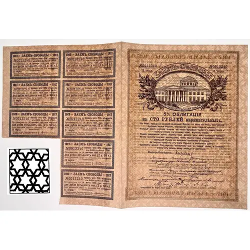 | Obverse description | Black on green-ish underprint. At the top center, oval frame depicts the Tauride Palace (seat of the State Duma), flanked by laurel branches. Directly beneath the vignette, bold text, with several paragraphs of smaller text filling the central area below, followed by a cluster of signatures. The serial number is printed twice—once at the upper left and again at the upper right. Framed by intricate guilloche frame with square corner ornaments. Coupon sheet to the left At least two stamps; round ОГБ (Отделения Государственного Банка/Office of the State Bank) and rectangular one. |
