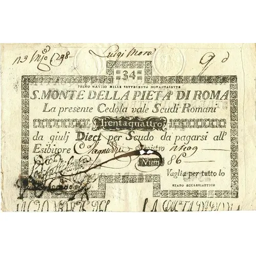 | Légende de l’avers | 34 PRIMO MAGGIO MILLE SETTICENTO NOVANTASETTE S. M. DI PIETA DI ROMA La presente Cedola vaglia Scudi Romani Trentaquattro da giulj dieci per Scudo da pagarsi all` Esibitore. |