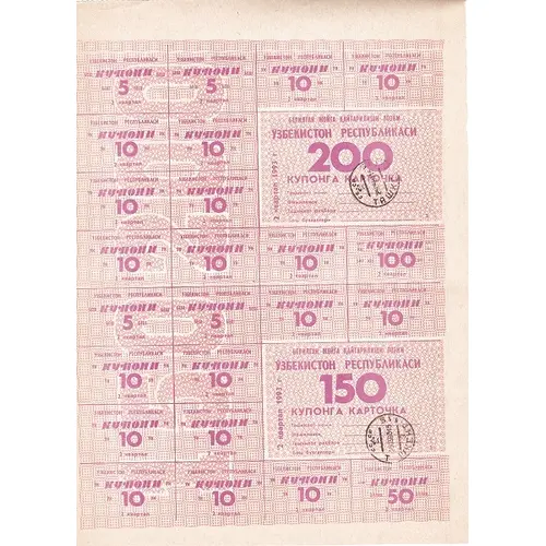 БЕРИЛГАН ЖОЙГА ҚАЙТАРИЛИШИ ЛОЗИМ ЎЗБЕКИСТОН РЕСПУБЛИКАСИ 200 КУПОНГА КАРТОЧКА Ташкилот номи __________ Фамилияси __________ Ташкилот раҳбари __________ Бош бухгалтери __________ 2 квартал 1993 г БЕРИЛГАН ЖОЙГА ҚАЙТАРИЛИШИ ЛОЗИМ ЎЗБЕКИСТОН РЕСПУБЛИКАСИ 150 КУПОНГА КАРТОЧКА Ташкилот номи __________ Фамилияси __________ Ташкилот раҳбари __________ Бош бухгалтери __________ М. Ў. 2 квартал 1993 г (Translation: The card of the Republic of Uzbekistan 200 coupons must be returned to the place of issue, Name of organisation/Last name/Head of the organization/Chief Accountant, 2nd quarter year 1993, The card of the Republic of Uzbekistan 150 coupons must be returned to the place of issue, Name of organisation/Last name/Head of the organization/Chief Accountant, 2nd quarter year 1993) |
